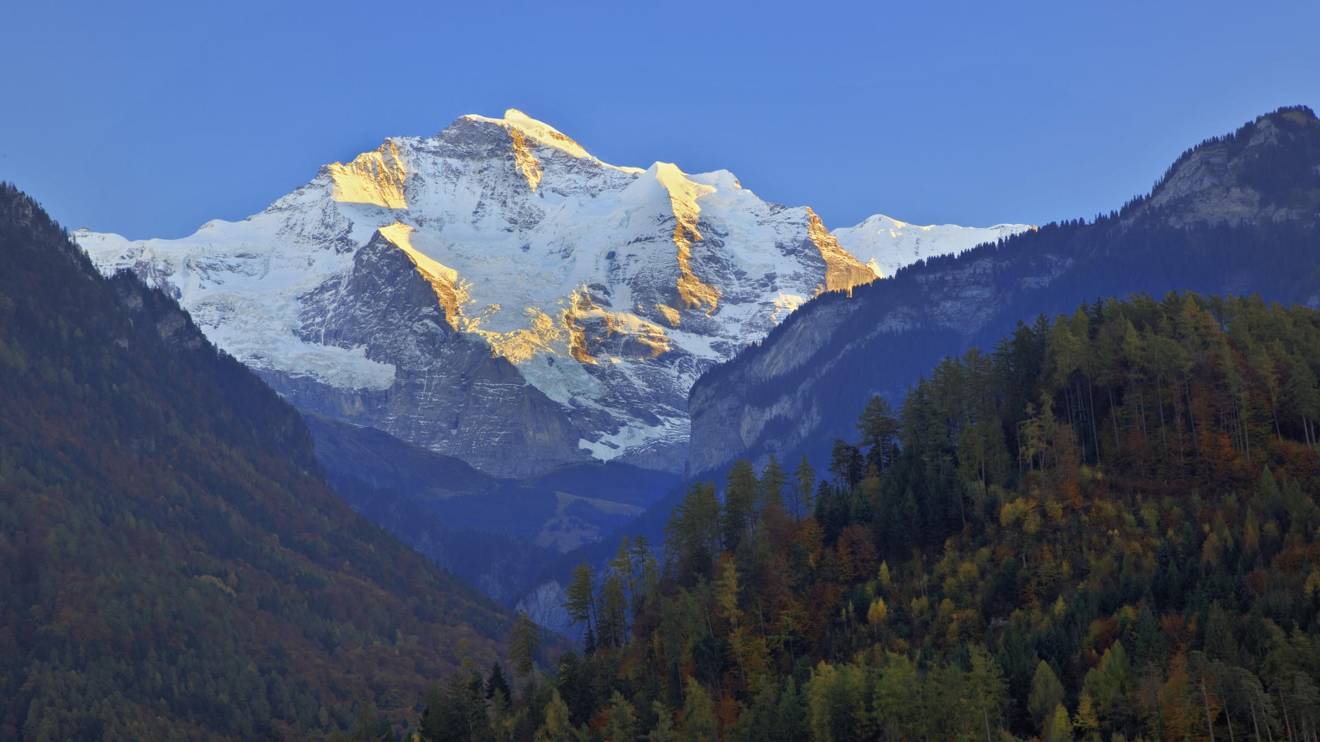 Cette vue imprenable sur la Jungfrau, surnommée la "Reine des Alpes", depuis Interlaken en Suisse, offre un spectacle visuel à couper le souffle. Le sommet enneigé de la Jungfrau se dresse majestueusement au-dessus des vallées verdoyantes et des lacs scintillants, dans une lumière cristalline qui met en valeur les contrastes saisissants entre la neige blanche, les roches sombres et le ciel bleu profond. Les montagnes environnantes, recouvertes d'une végétation luxuriante, s'étagent en harmonie avec le décor, créant un paysage alpin typique de la Suisse. Cette image en haute définition, disponible en 1920x1080 pixels, transporte le spectateur au cœur des Alpes suisses, offrant une échappée visuelle en Suisse, dans la région d'Interlaken, près du célèbre massif de la Jungfrau. Un fond d'écran idéal pour les amoureux de la montagne et des grands espaces.