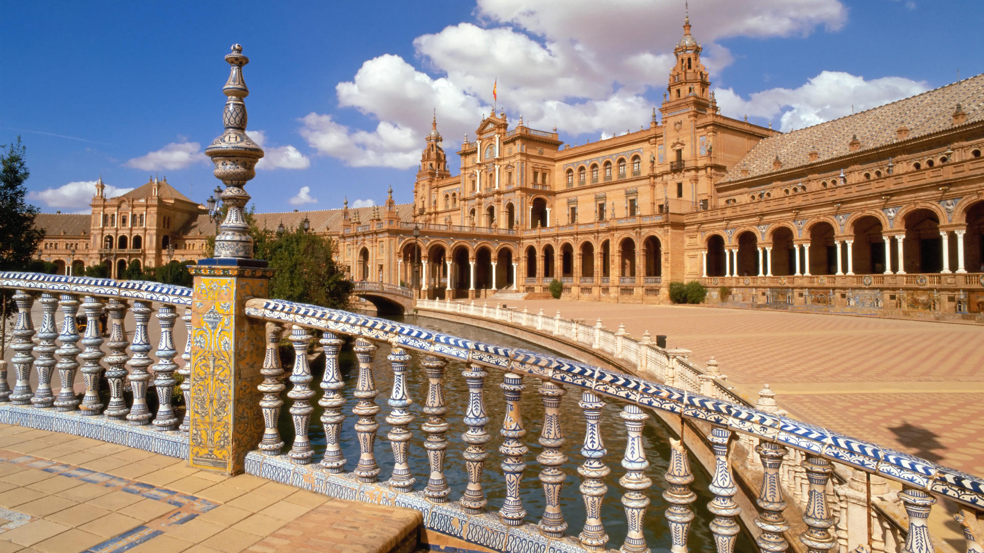 Découvrez la majestueuse Plaza de España de Séville en Espagne avec ce magnifique fond d'écran. Cette image en haute définition (1920x1080) capture l'essence de ce lieu emblématique avec ses tuiles colorées, son architecture néoclassique et son ambiance ensoleillée. La scène est baignée de lumière, mettant en valeur les détails ornés et les éléments d'eau qui ajoutent une touche de sérénité à l'ensemble. Un fond d'écran idéal pour les amoureux de l'Espagne et de son riche patrimoine culturel, il apportera une touche d'élégance et de voyage à votre écran.