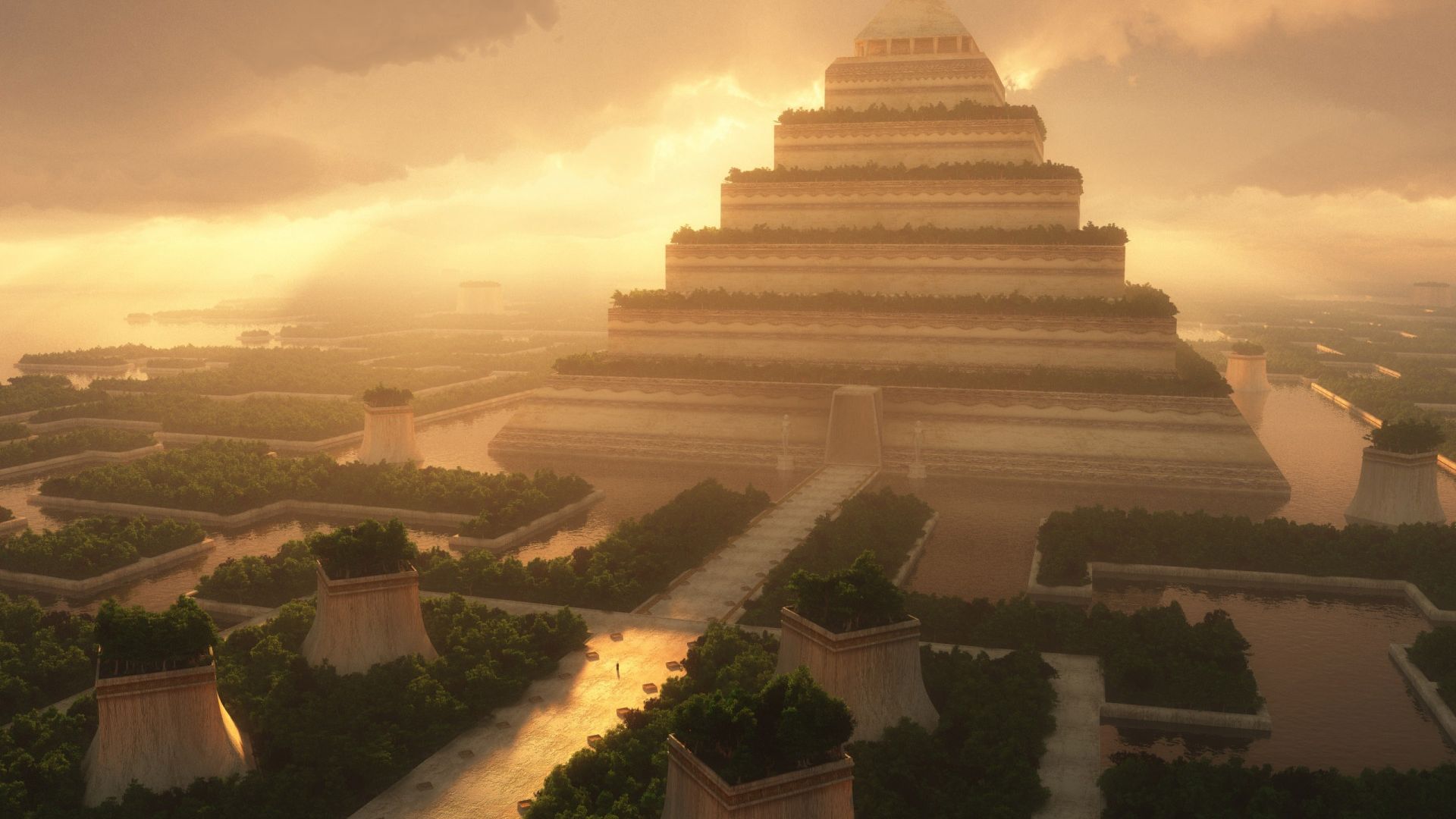 Plongez dans l'évasion ultime avec ce wallpaper HD 1920x1080 mêlant architecture antique et futuriste : un temple colossal à colonnades dorées flotte au-dessus d'une pyramide géométrique aux arêtes de cristal, tandis qu'un ciel crépuscule baigne l'ensemble d'une lumière orangée. Reflets néons et végétation luminescente ponctuent le paysage 3D, offrant un fond d'écran haute résolution parfait pour sublimer votre écran. Téléchargez ce chef-d'œuvre Art & Design et laissez la magie des civilisations anciennes revisitées hanter votre quotidien.