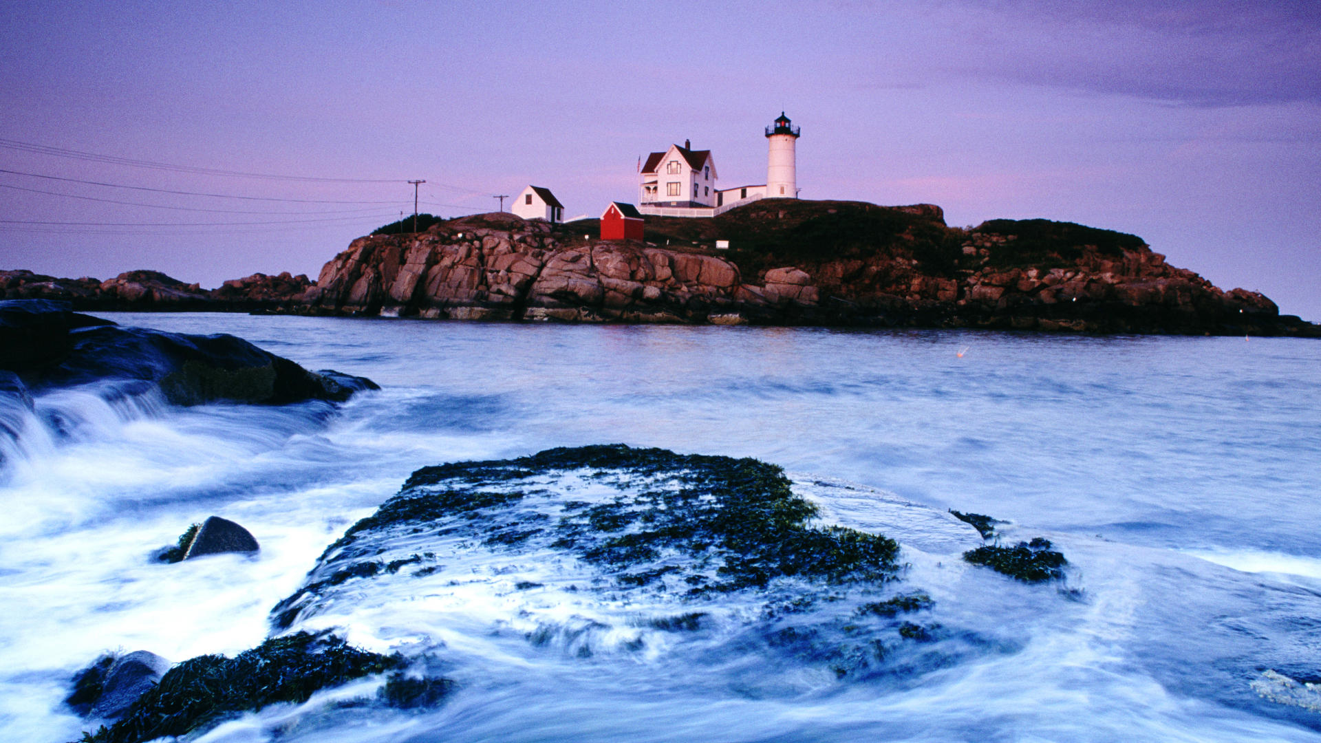 Ce fond d'écran HD 1920x1080 capture le phare emblématique de Cape Neddick au Maine, une image incontournable pour les amateurs de phares et de paysages côtiers américains. Le Nubble Lighthouse se dresse fièrement sur son îlot rocheux, sa tour blanche et sa lanterne rouge créant un contraste saisissant avec l'océan bleu profond. Les vagues viennent mourir doucement contre les falaises granitiques tandis que le ciel dégage une lumière dorée typique de la Nouvelle-Angleterre. Ce wallpaper HD transporte instantanément le charme maritime du Maine sur votre écran, offrant une évasion visuelle parfaite. Les amateurs de voyages et de photographie maritime apprécieront la qualité cristalline de cette image, idéale pour personnaliser votre bureau avec un paysage côtier authentique et apaisant.