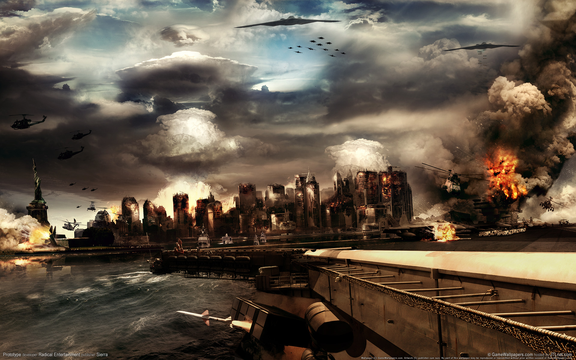 Le fond d'écran Prototype 11 en 1920x1200 HD capte l'essence brutale du jeu d'action à monde ouvert de Radical Entertainment. On y voit Alex Mercer, protagoniste anti-héritique, planant au-dessus d'un Manhattan dévasté : immeubles éventrés, flammes orange lèchent des carcasses de voitures et la brume ajoute une ambiance post-apocalyptique. Ses bras se transforment en lames biométalliques, symbole de sa capacité à consumer et à imiter quiconque. Ce wallpaper 16:10 offre des détails aiguisés sur les textures organiques du personnage, le contraste entre lumière des incendies et ombres profondes, parfait pour écrans larges et multimédia.